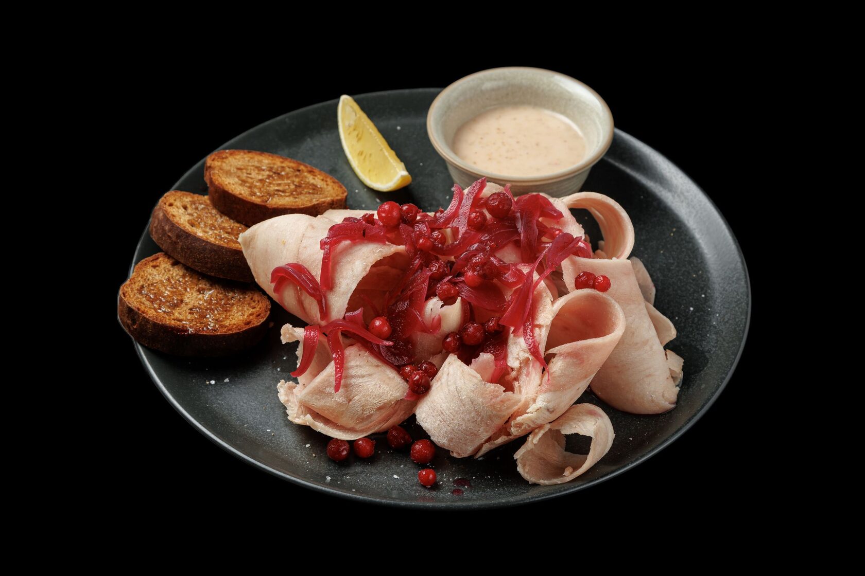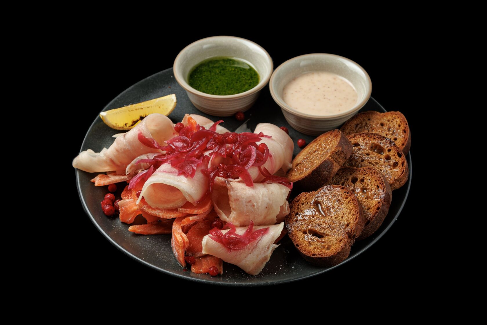 Тонкие ломтики пеламиды с маринованным луком, брусникой, специальным соусом и ржаным хлебом