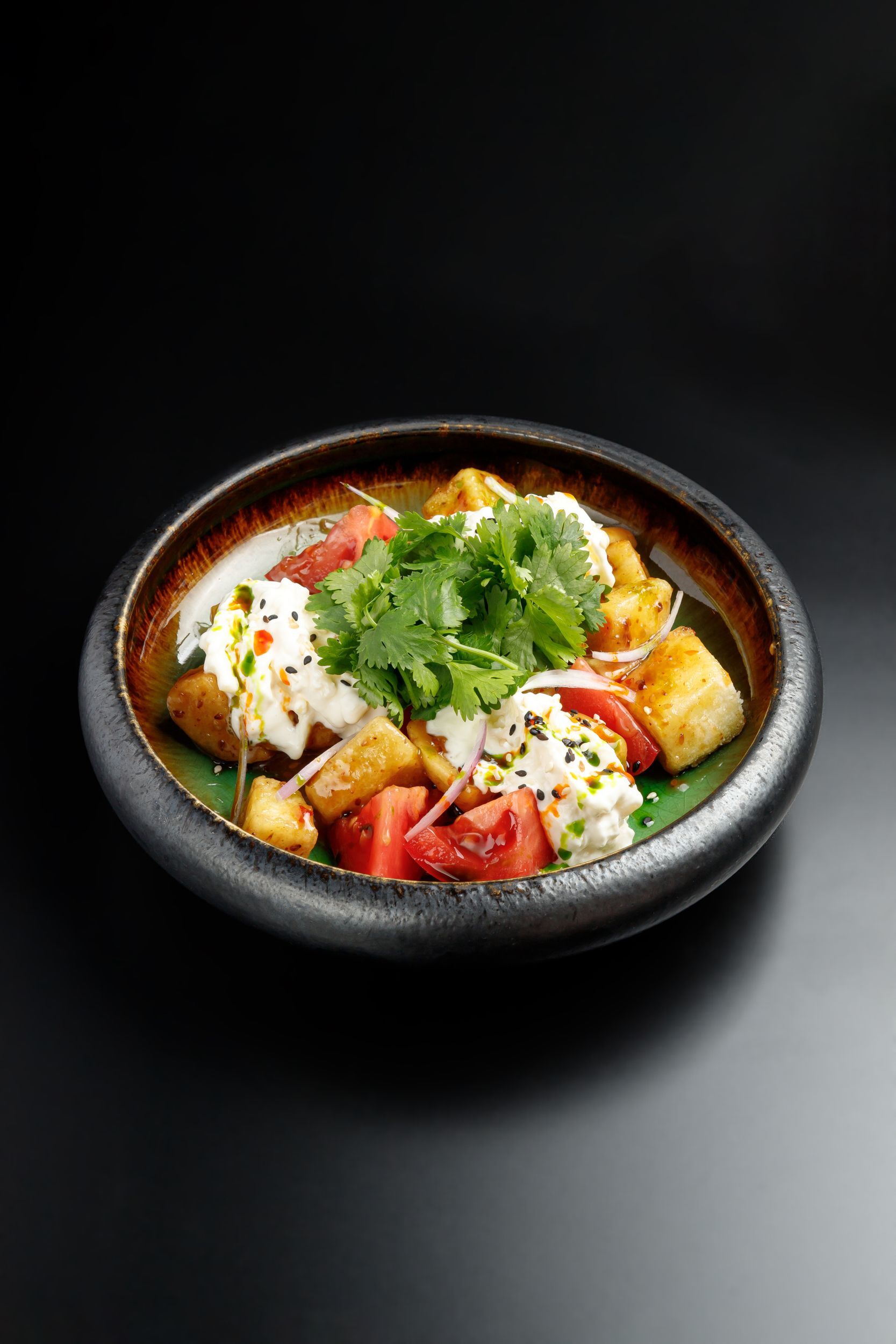 Баклажан в темпуре с розовыми томатами, страчателлой, кинзой, свит чили, барбекю и кунжутом, где хруст баклажана встречается с кремовостью сыра.