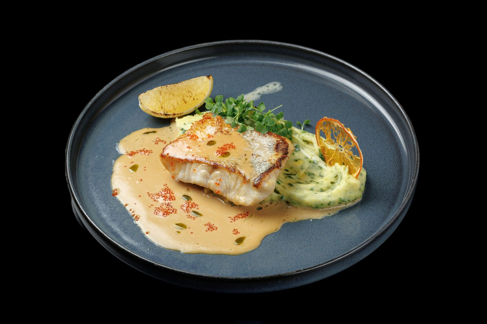 Филе судака с картофельным пюре, шпинатом, сливками, пармезаном, сливочно-устричным соусом и икрой тобика