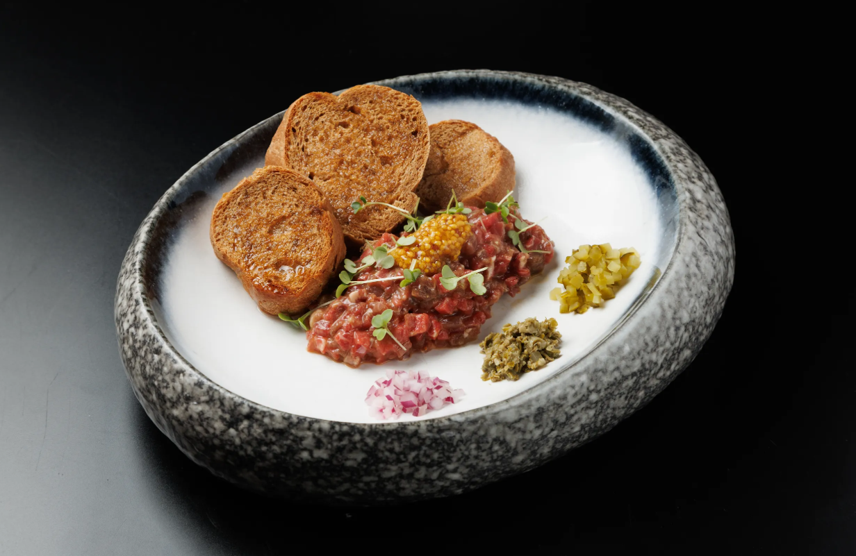 Свежая говяжья вырезка с красным луком, каперсами, маринованным огурцом, чесноком, зернистой горчицей, желтком и белым хлебом
