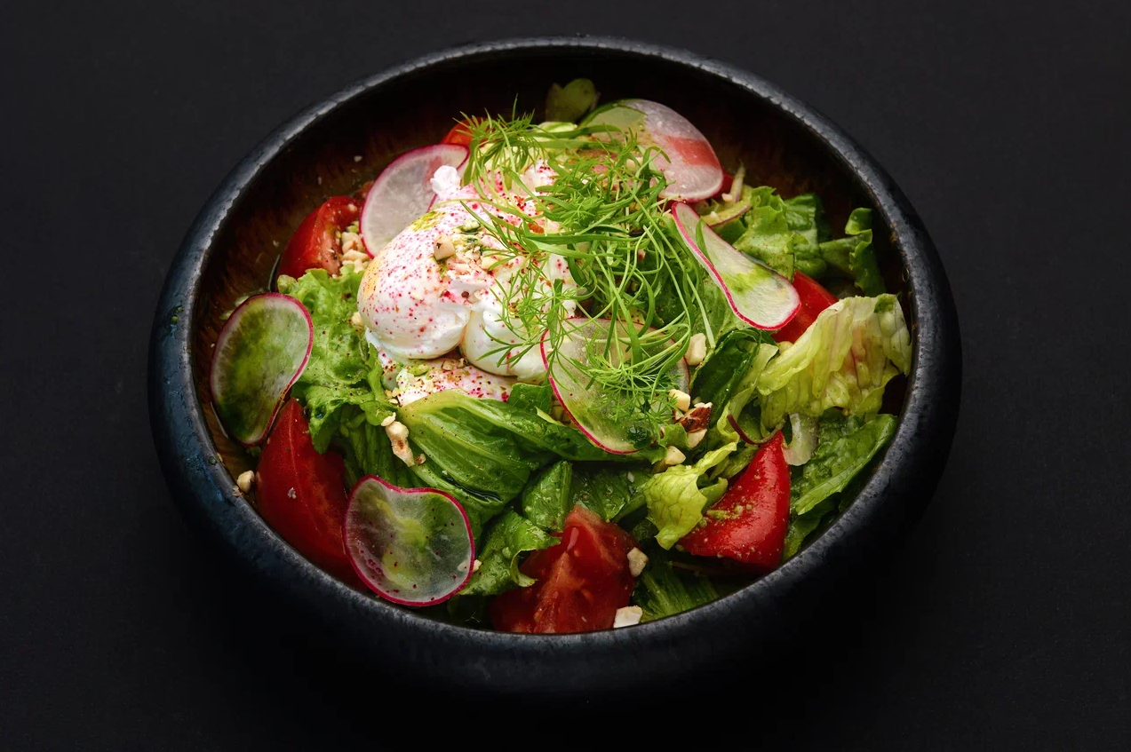 Микс салатов (айсберг, романо, латук) с розовыми томатами, запеченным перцем, эдамаме, красным луком, яйцом пашот, песто, редисом и миксом орехов