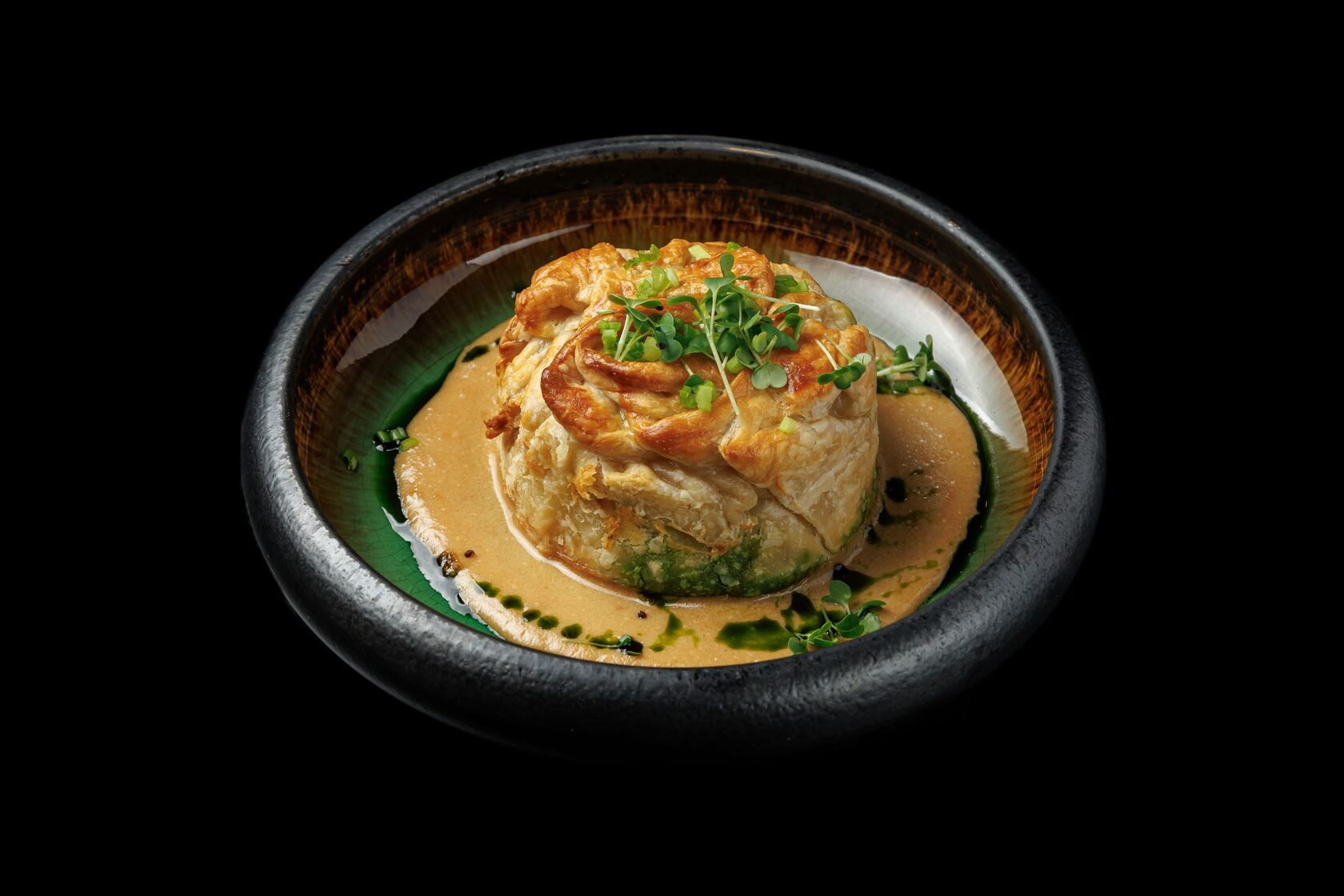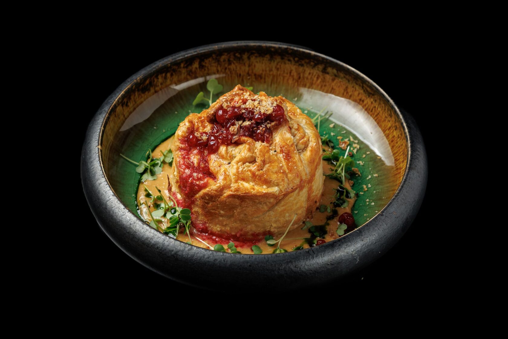 Слоеное тесто с томленной говядиной в темном пиве, луком криспи, брусникой в сахаре и сливочно-устричным соусом