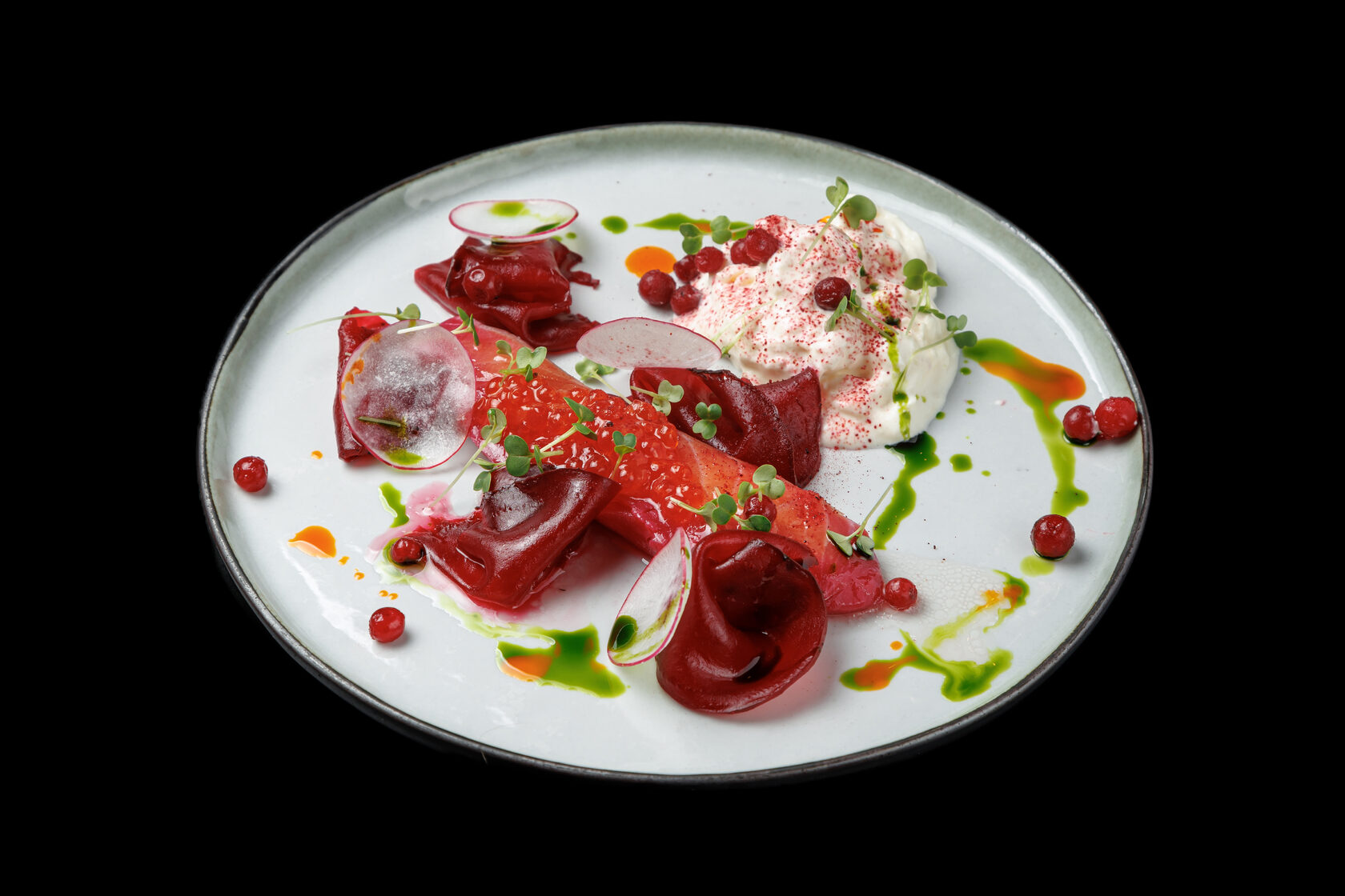 Лосось гравлакс с печеной свеклой, страчателлой, голубикой, красной икрой и соусом гравлакс
