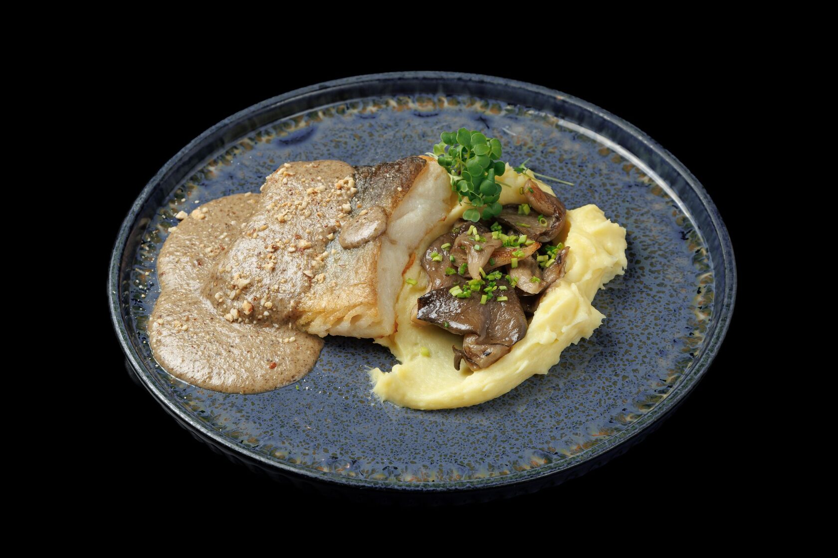 Филе трески с пюре, вешенками и грибным соусом