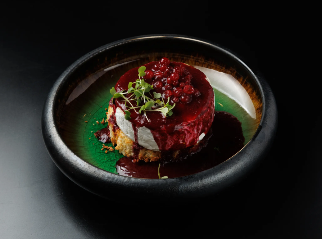 Камамбер в бриоши (сдобная булочка) с ежевичным чатни (сладко-кислый ягодный соус)