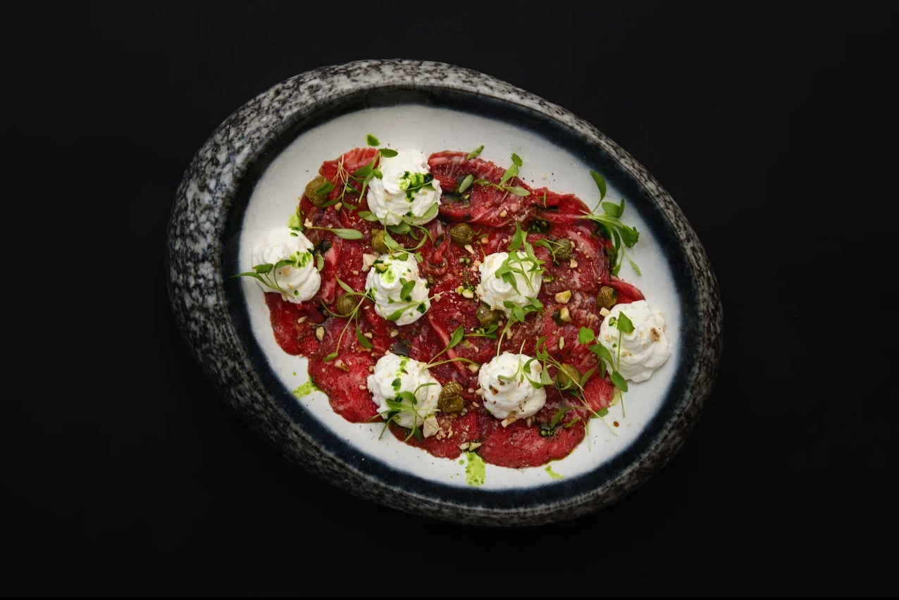 Тонкие слайсы вырезки молодого бычка с трюфельным маслом, муссом пармезана и каперсами